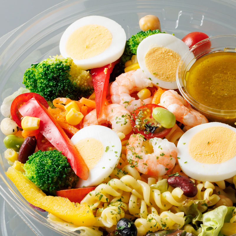 原材料名 マカロニ(国内製造)、レタス、サニーレタス、卵、ブロッコリー、ミニトマト、エビ、豆サラダ、パプリカ、紫キャベツ、キャッロットラペ、コーン、パセリ / 硫酸鉄、シリコーン(一部に小麦・卵・エビを含む)く添付ドレッシング>すりおろ野菜ドレッシング、バジルペースト / pH調整剤、調味料(アミノ酸)、増粘多糖類、アナトー色素、カロテン色素、(一部に小麦・卵・乳成分を含む) |